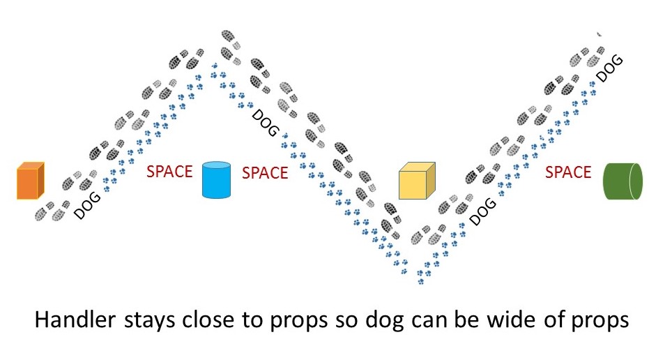 Here is an example of a prop weave: The dog and handler team heel in a serpentine through 3 or 4 props spaced 4-6 feet apart. You will always enter the prop weave with the first prop to your left. Remember that your dog may be heeling on your left or your right.